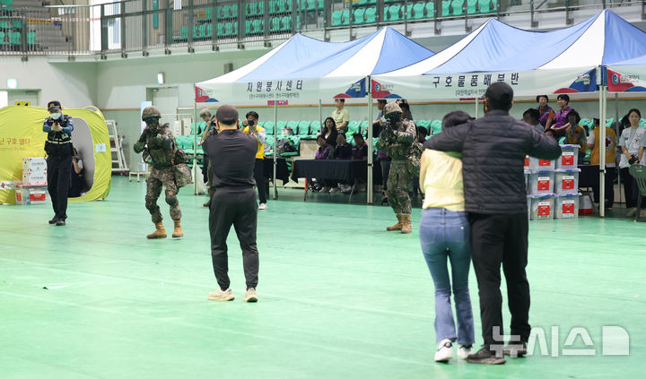 [인천=뉴시스] 전진환 기자 = 20일 오후 인천 연수구 선학체육관에서 실시된 2025 을지연습 - 서해5도 출도주민 수용구호훈련에서 체육관에 침투한 북한 특작부대원이 인질극을 벌이고 있다. 2025.08.20. [email protected]