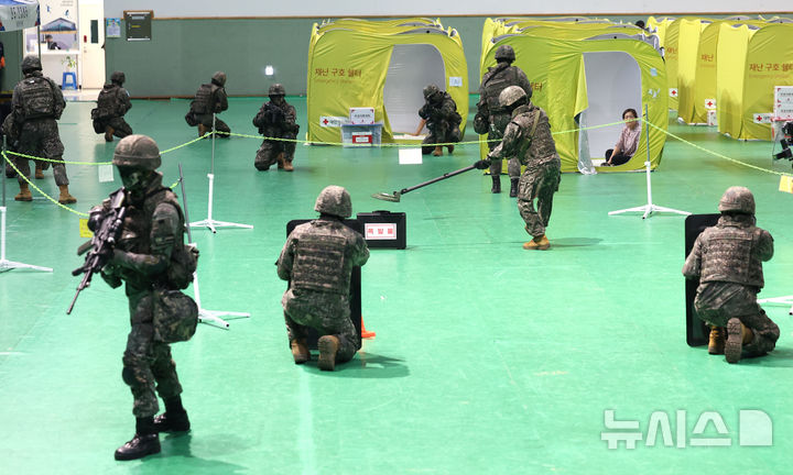 [인천=뉴시스] 전진환 기자 = 20일 오후 인천 연수구 선학체육관에서 실시된 2025 을지연습 - 서해5도 출도주민 수용구호훈련에서 17사단 장병들이 체육관에서 발견된 폭발물 의심 가방을 조사하고 있다. 2025.08.20. [email protected]