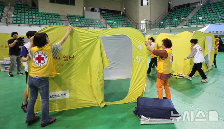 [인천=뉴시스] 전진환 기자 = 20일 오후 인천 연수구 선학체육관에서 열린 2025 을지연습 - 서해5도 출도주민 수용구호훈련에서 적십자 인천지사 직원 및 봉사원들이 쉘터를 설치하고 있다. 2025.08.20. [email protected]