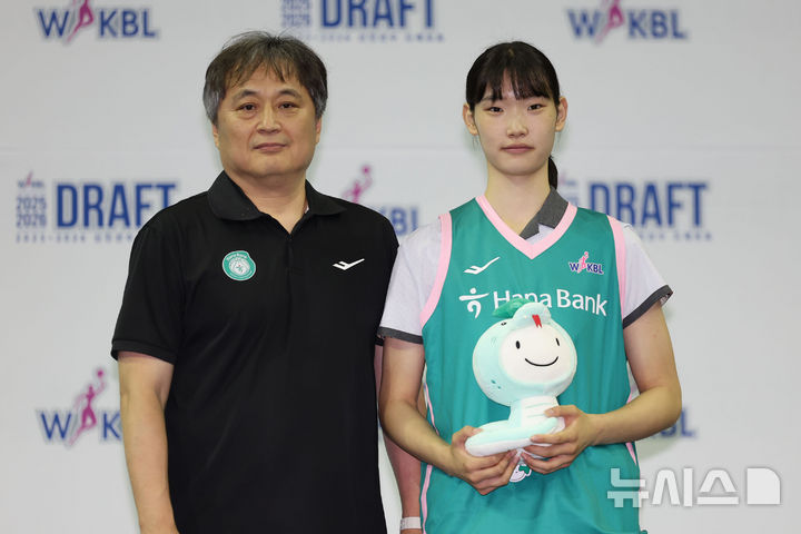 [부천=뉴시스] 권창회 기자 = 20일 오후 경기 부천시 부천체육관에서 열린 여자프로농구(WKBL) 2025~2026 신인선수 드래프트에서 1라운드 4순위로 하나은행에 지명된 선일여고 황윤서가 이상범 감독과 기념촬영을 하고 있다. 2025.08.20. [email protected]