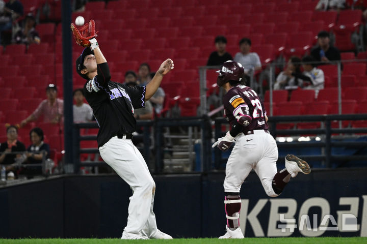 [광주=뉴시스] 이영주 기자 = 20일 오후 광주 북구 광주-기아챔피언스필드에서 열린 2025 신한 쏠뱅크 KBO 리그 키움히어로즈 대 KIA타이거즈의 경기, 5회초 키움 임지열이 날린 플라이 타구를 KIA 1루수 오선우가 잡아내고 있다. 2025.08.20. [email protected]