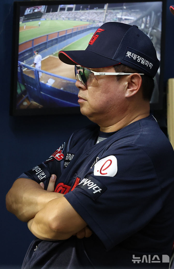 [서울=뉴시스] 김선웅 기자 = 20일 서울 송파구 잠실야구장에서 열린 2025 프로야구 롯데 자이언츠 vs LG 트윈스 경기, 롯데 김태형 감독이 경기를 지켜보고 있다. 2025.08.20. [email protected]