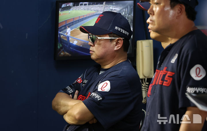 [서울=뉴시스] 김선웅 기자 = 20일 서울 송파구 잠실야구장에서 열린 2025 프로야구 롯데 자이언츠 vs LG 트윈스 경기, 롯데 김태형 감독이 경기를 지켜보고 있다. 2025.08.20. [email protected]