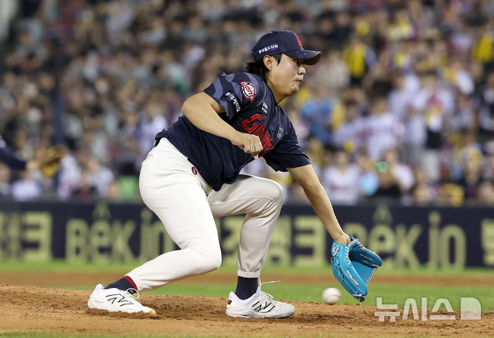 [서울=뉴시스] 김선웅 기자 = 20일 서울 송파구 잠실야구장에서 열린 2025 프로야구 롯데 자이언츠 vs LG 트윈스 경기, 6회말 2사 주자 1,2루 상황 롯데 교체투수 정철원이 LG 구본혁의 타구를 놓치고 있다. 2025.08.20. [email protected]