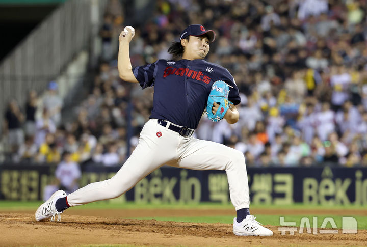 [서울=뉴시스] 김선웅 기자 = 20일 서울 송파구 잠실야구장에서 열린 2025 프로야구 롯데 자이언츠 vs LG 트윈스 경기, 6회말 롯데 교체투수 정철원이 역투하고 있다. 2025.08.20. [email protected]