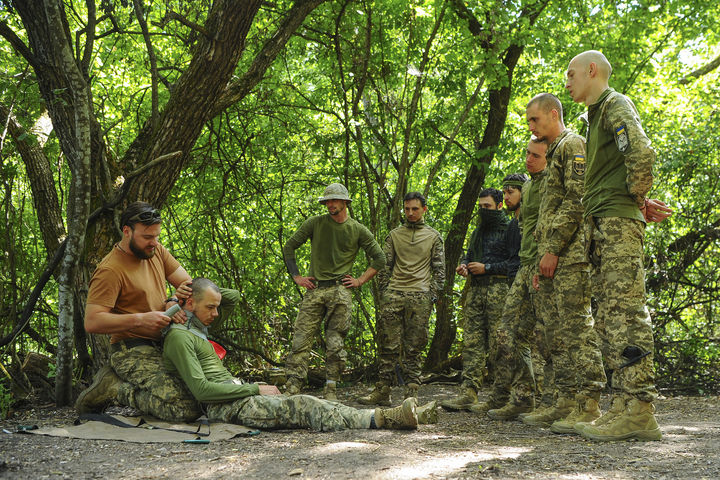[하르키우=AP/뉴시스] 우크라이나 방위군이 제공한 사진에 지난 19일(현지 시간) 우크라이나 제127여단 소속, 18~24세 신병들이 하르키우 인근 훈련장에서 응급 처치 요령을 배우고 있다. 2025.08.21.