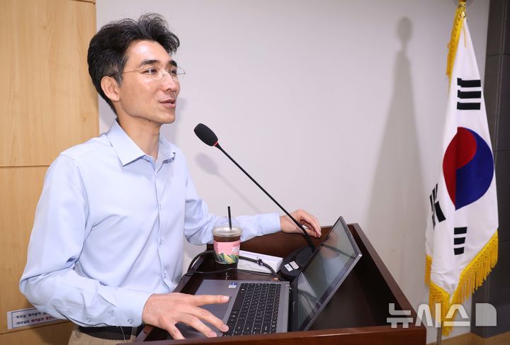 [서울=뉴시스] 조성봉 기자 = 국정기획위원회 자문위원인 강형구 한양대 교수가 21일 오전 서울 여의도 국회 의원회관 간담회의실에서 열린 '민생경제와 혁신성장 포럼, 디지털자산과 스테이블코인 정책 어떻게 추진해야 하나?' 세미나에서 강연을 하고 있다. 2025.08.21. [email protected]