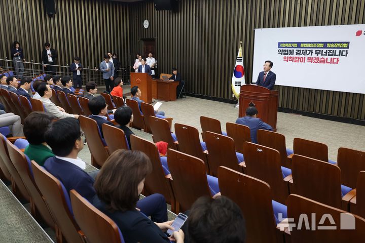 [서울=뉴시스] 조성봉 기자 = 송언석 국민의힘 비상대책위원장 겸 원내대표가 21일 오전 서울 여의도 국회에서 열린 의원총회에서 발언을 하고 있다. 2025.08.21. [email protected]