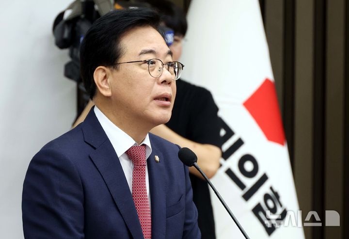 [서울=뉴시스] 조성봉 기자 = 송언석 국민의힘 비상대책위원장 겸 원내대표가 21일 오전 서울 여의도 국회에서 열린 의원총회에서 발언을 하고 있다. 2025.08.21. [email protected]