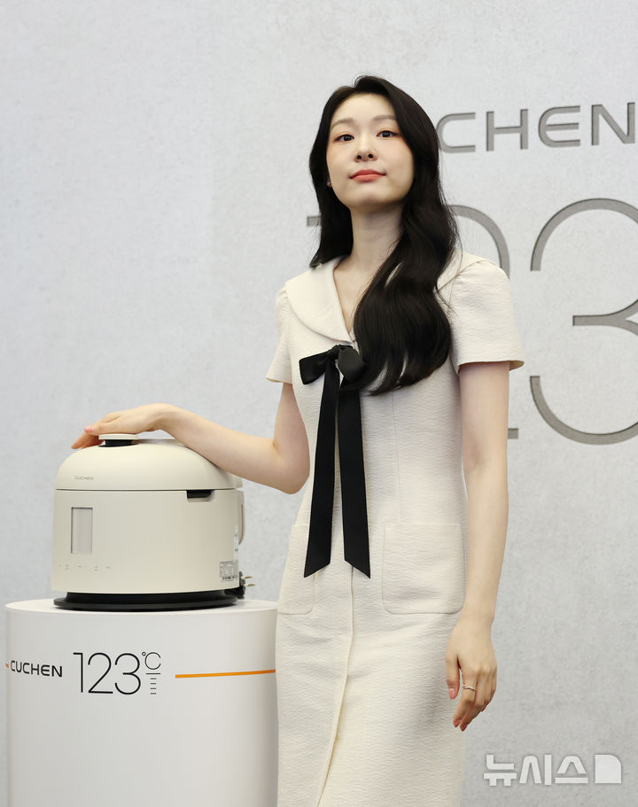 [서울=뉴시스] 조성우 기자 = 전 피겨스케이팅 선수 김연아가 21일 오전 서울 강남구 그랜드 인터컨티넨탈 서울 파르나스 호텔에서 열린 쿠첸 '123 밥솥' 출시 기념 미디어데이에서 포즈를 취하고 있다. 2025.08.21. [email protected]