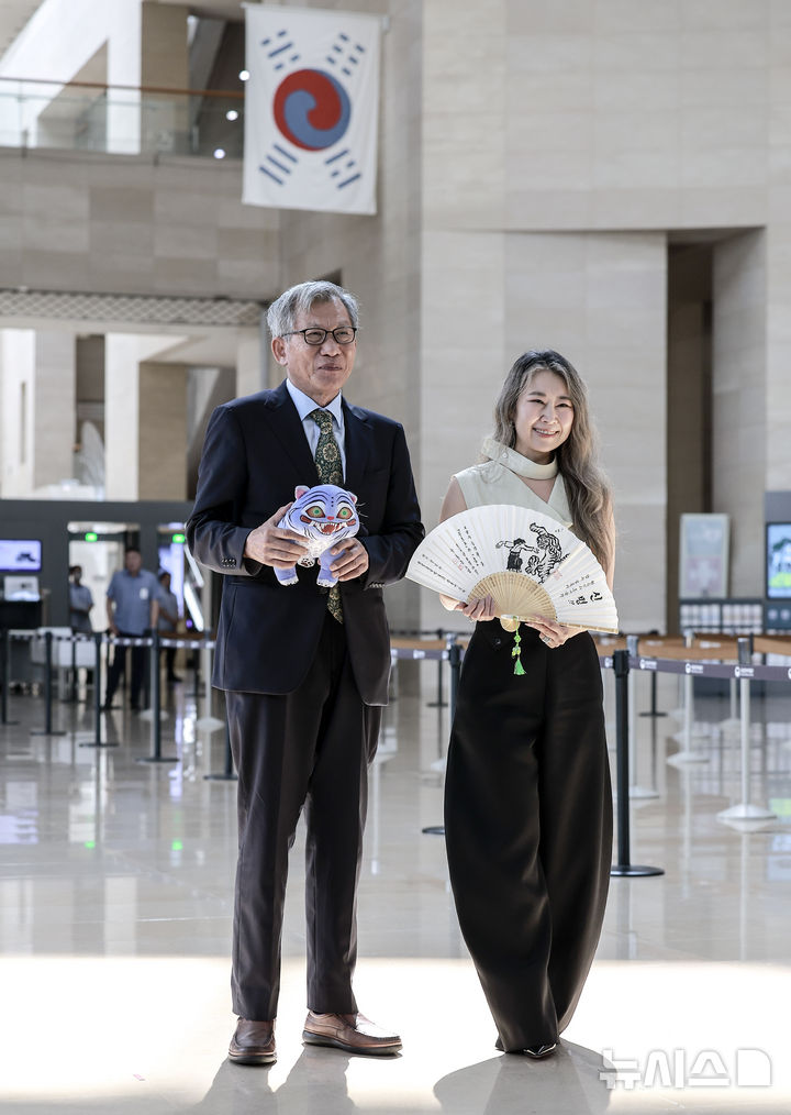 [서울=뉴시스] 정병혁 기자 = 유홍준 국립중앙박물관장과 넷플릭스 영화 '케이팝 데몬 헌터스'의 메기 강 감독이 21일 서울 용산구 국립중앙박물관에서 만나 인사를 나누며 선물을 들고 사진을 찍고 있다. 2025.08.21. [email protected]