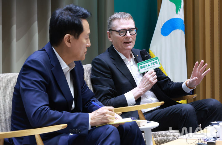 [서울=뉴시스] 이영환 기자 = 오세훈 서울시장과 2024년 노벨경제학상 수상자 제임스 로빈슨 교수가 21일 서울 중구 서울시청 대회의실에서 특별대담을 하고 있다. 2025.08.21. [email protected]