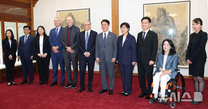 왼쪽부터 김진아 외교부2차관, 민기 총리 비서실장, 박수현 게이츠재단 한국총괄, 조 셀렐 유럽,중동, 동아시아 대외협력 총괄이사, 트레버 문델 글로벌 보건 부문 이사, 빌 게이츠 이사장, 김민석 총리, 정은경 보건복지부 장관, 윤창렬 국무조정실장, 최혜영 총리공보실장, 미호코 카시와쿠라 동아시아 총괄. 2025.08.21. [email protected]