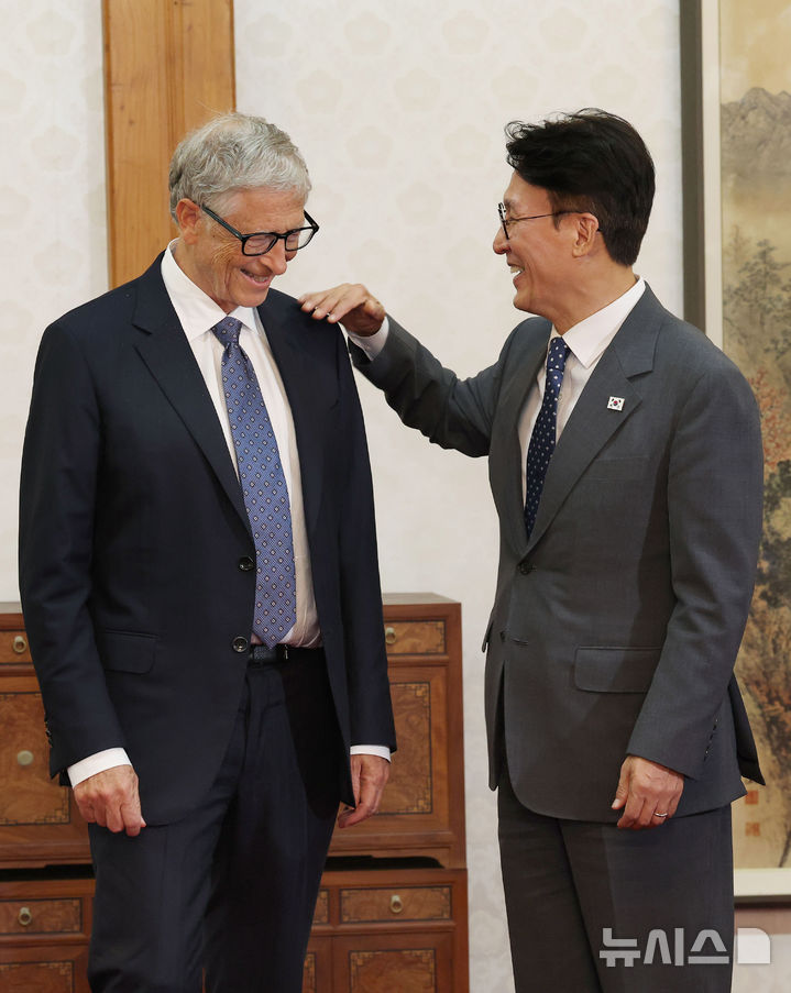 [서울=뉴시스] 청사사진기자단 = 김민석 국무총리가 21일 오전 서울 종로구 총리공관에서 열린 오찬회담에서 빌게이츠 게이츠재단 이사장의 옷 먼지를 털어주고 있다. 2025.08.21. [email protected]