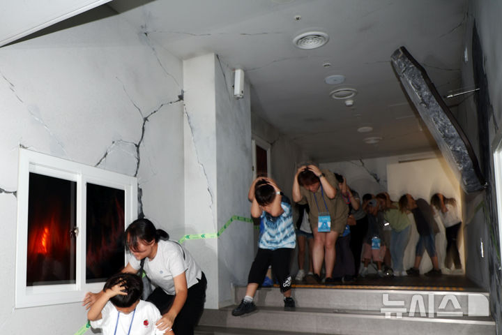 [부산=뉴시스] 하경민 기자 = 21일 부산 강서구 부산시교육청 학생안전체험관에서 열린 '가족안전캠프'에 참가한 어린이와 부모가 지진 발생에 따른 건물 내 대피 체험을 하고 있다.