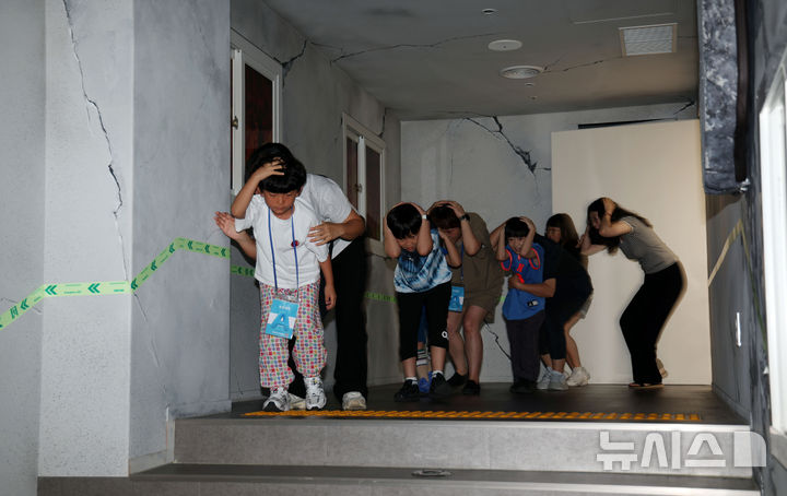 [부산=뉴시스] 하경민 기자 = 21일 부산 강서구 부산시교육청 학생안전체험관에서 열린 '가족안전캠프'에 참가한 어린이와 부모가 지진 발생에 따른 건물 내 대피 체험을 하고 있다.