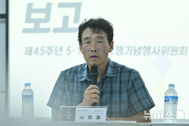 [광주=뉴시스] 이영주 기자 = 서정훈 제45주년5·18민중항쟁기념행사 모니터링단장이 21일 오후 광주 동구 전일빌딩245에서 열린 제45주년5·18민중항쟁기념행사 평가토론회에서 발표하고 있다. 2025.08.21. [email protected]