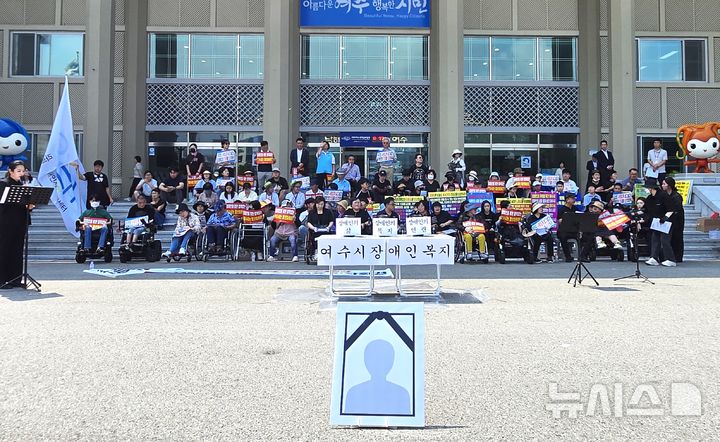 [여수=뉴시스] 김석훈 기자 = 22일 오전 전남 여수시청 현관에서 라르쉬장애인자립생활센터 장애인들이 '중증장애인의 주권 회복과 지역사회 활동을 지원하라' 주제로 기자회견 하고 있다. 2025.08.22. [email protected]