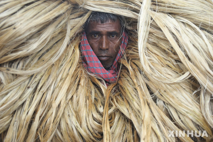 [마니간지=신화/뉴시스] 지난 20일(현지 시간) 방글라데시 마니간지의 황마(jute) 시장에서 한 노동자가 황마를 나르고 있다. 방글라데시는 세계에서 가장 큰 황마 생산·유통 중심지 중 하나로, 황마는 방글라데시 경제와 농업에서 매우 중요한 역할을 한다. 황마는 천연 섬유로, 튼튼하고 내구성이 강해 밧줄, 포대, 직물, 카펫, 수공예품 등에 사용된다. 2025.08.22.