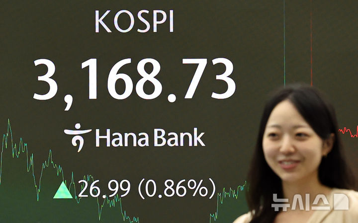 [서울=뉴시스] 최진석 기자 = 코스피가 전 거래일(3141.74)보다 26.99포인트(0.86%) 오른 3168.73에 장을 마친 22일 오후 서울 중구 하나은행 딜링룸 전광판에 지수가 표시되어 있다. 코스닥 지수는 전 거래일(777.24)보다 5.27포인트(0.68%) 상승한 782.51에 마감, 서울 외환시장에서 원·달러 환율은 전 거래일 주간거래 종가(1398.4원)보다 5.2원 내린 1393.2원에 주간 거래를 마감했다. 2025.08.22. [email protected]