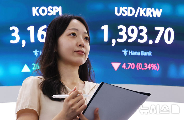 [서울=뉴시스] 최진석 기자 = 서울 외환시장에서 원·달러 환율이 전 거래일 주간거래 종가(1398.4원)보다 5.2원 내린 1393.2원에 주간 거래를 마감한 22일 오후 서울 중구 하나은행 딜링룸 전광판에 원·달러 환율 현황이 표시되어 있다. 코스피가 전 거래일(3141.74)보다 26.99포인트(0.86%) 오른 3168.73에 장을 마감, 코스닥 지수는 전 거래일(777.24)보다 5.27포인트(0.68%) 상승한 782.51에 거래를 마쳤다. 2025.08.22. [email protected]