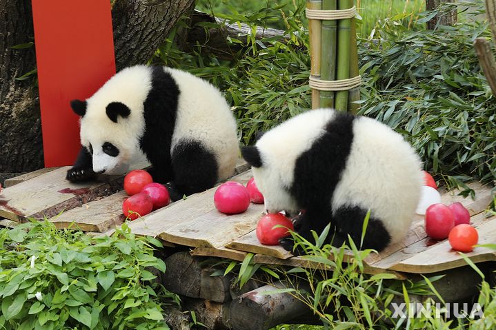 [베를린=신화/뉴시스] 22일(현지 시간) 독일 베를린 동물원에서 첫돌을 맞은 자이언트판다 레니(멍하오)와 로티(멍톈)가 생일 특식을 먹고 있다. 지난해 8월 22일 태어난 레니와 로티는 독일에서 태어난 두 번째 자이언트판다 쌍둥이로 이들의 부모인 멍멍과 자오칭은 2017년 중국 청두 판다 기지에서 베를린으로 왔다. 2025.08.23.