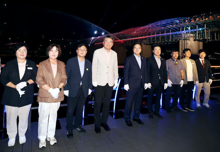 [서울=뉴시스] 황준선 기자 = 오승록 노원구청장이 지난 22일 서울 노원구 경춘철교 음악분수 개장식에 참석해 기념촬영을 하고 있다. (사진=노원구 제공) 2025.08.23. [email protected] *재판매 및 DB 금지