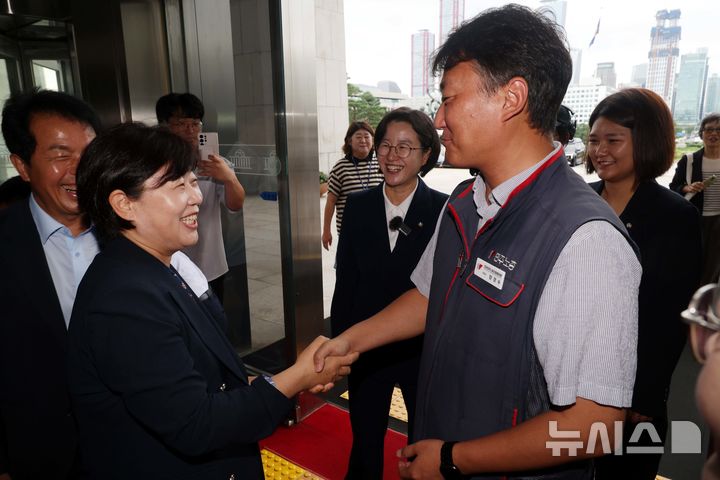 [서울=뉴시스] 조성봉 기자 = 양경수 민주노총 위원장이 23일 서울 여의도 국회에서 열린 '노조법 2,3조 개정안 관련 노동자 필리버스터(무제한토론)에 앞서 서영교 더불어민주당 의원과 악수하고 있다. 2025.08.23. [email protected]