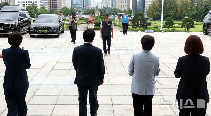 [서울=뉴시스] 조성봉 기자 = 양경수 민주노총 위원장이 23일 서울 여의도 국회에서 열린 '노조법 2,3조 개정안 관련 노동자 필리버스터(무제한토론)에 참석하기 위해 이동하고 있다. 윤종오 진보당 원내대표를 비롯한 의원들이 양 위원장을 맞이하고 있다. 2025.08.23. [email protected]