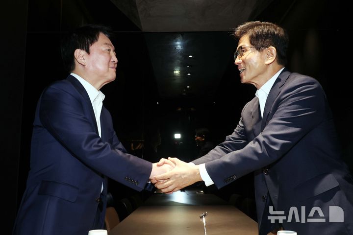 [서울=뉴시스] 조성봉 기자 = 김문수 국민의힘 당대표 후보가 23일 서울 여의도의 한 식당에서 안철수 의원과 오찬회동을 하기 전 악수를 하고 있다. 2025.08.23. [email protected]
