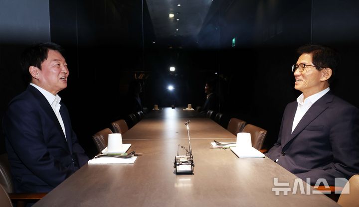 [서울=뉴시스] 조성봉 기자 = 김문수 국민의힘 당대표 후보가 23일 서울 여의도의 한 식당에서 안철수 의원과 오찬회동을 하고 있다. 2025.08.23. [email protected]