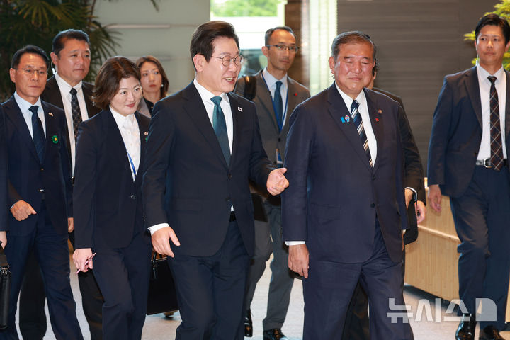 [도쿄(일본)=뉴시스] 고범준 기자 = 이재명 대통령과 이시바 시게루 일본 총리가 23일(현지 시간) 일본 도쿄 총리 관저에서 정상회담을 하기 위해 이동하고 있다. 2025.08.23. [email protected]