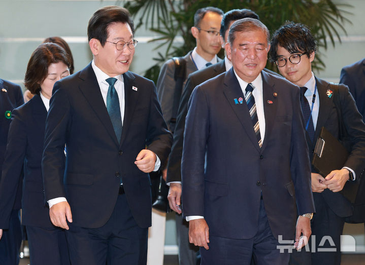 [도쿄(일본)=뉴시스] 고범준 기자 = 이재명 대통령과 이시바 시게루 일본 총리가 23일(현지 시간) 일본 도쿄 총리 관저에서 정상회담을 하기 위해 이동하고 있다. 2025.08.23. [email protected]