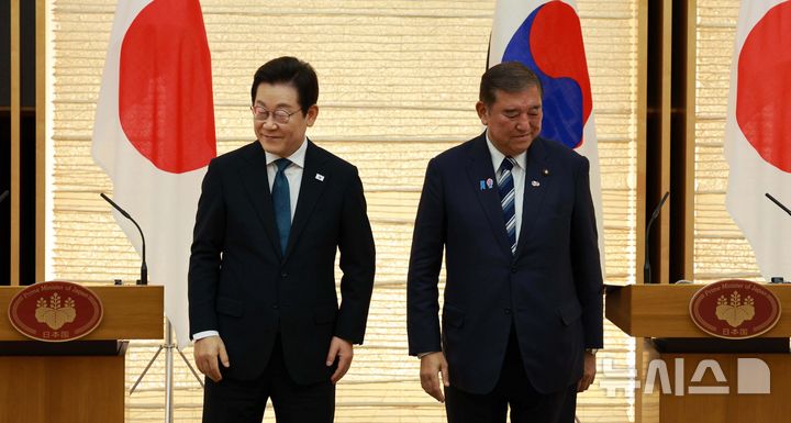 [도쿄=뉴시스] 고범준 기자 = 이재명 대통령과 이시바 시게루 일본 총리가 23일(현지 시간) 일본 도쿄 총리 관저에서 한일 공동언론발표를 마친 뒤 이동하고 있다. 2025.08.23. [email protected]