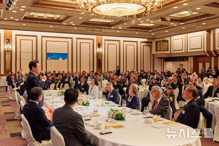 [도쿄=뉴시스] 고범준 기자 = 한일 정상회담을 위해 일본을 방문중인 이재명 대통령이 23일(현지 시간) 일본 도쿄의 한 호텔에서 열린 재일동포 오찬 간담회에서 발언하고 있다. (공동취재) 2025.08.23. [email protected]