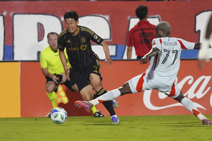 [프리스코=AP/뉴시스] 로스앤젤레스(LA) FC의 손흥민이 23일(현지 시간) 미 텍사스주 프리스코 도요타 스타디움에서 열린 2025 메이저리그사커(MLS) FC 댈러스와 경기 중 상대 공격수를 제치고 돌파를 시도하고 있다. 손흥민은 전반 6분 프리킥으로 선제골을 넣어 MLS 데뷔골을 기록했다. 2025.08.24.