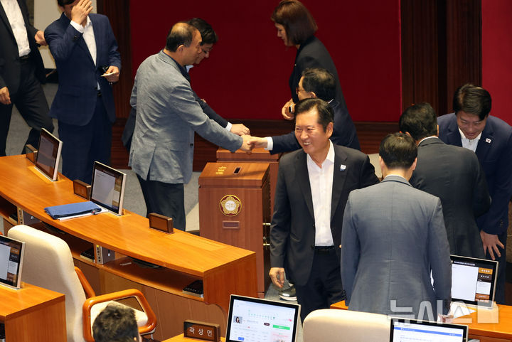[서울=뉴시스] 김금보 기자 = 정청래 더불어민주당 대표가 24일 오전 서울 여의도 국회에서 열린 제428회 국회(임시회) 제2차 본회의에서 밝게 웃고 있다. 2025.08.24. [email protected]