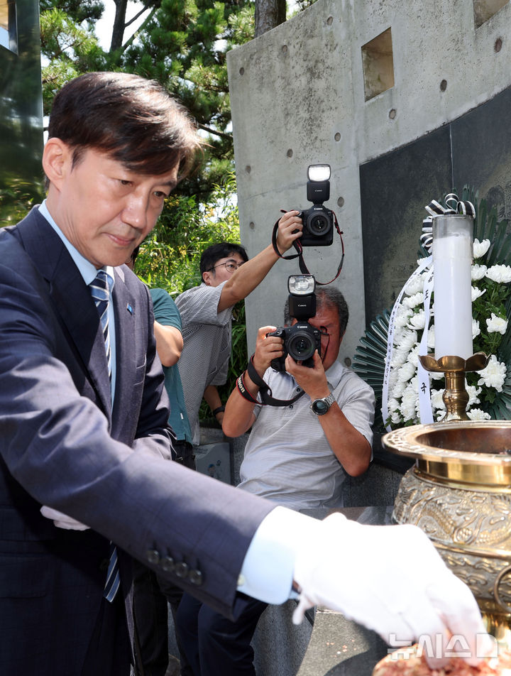 [부산=뉴시스] 하경민 기자 = 조국 전 조국혁신당 대표가 24일 부산 중구 민주공원에서 넋기림마당(추념의장)을 참배하고 있다. 2025.08.24. [email protected]