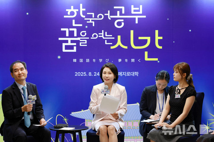 [도쿄=뉴시스] 고범준 기자 = 김혜경 여사가 24일(현지 시간) 일본 도쿄 메지로대학교를 방문해 한국어학과 학생들과 대화를 하고 있다. 2025.08.24. [email protected]