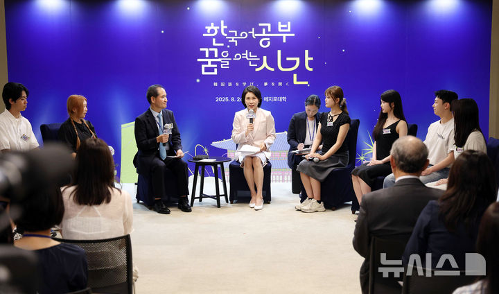 [도쿄=뉴시스] 고범준 기자 = 김혜경 여사가 24일(현지 시간) 일본 도쿄 메지로대학교를 방문해 한국어학과 학생들과 대화를 하고 있다. 2025.08.24. [email protected]