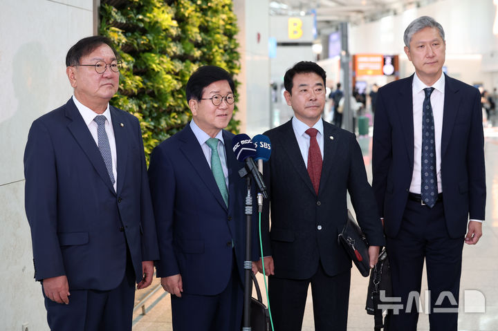 [인천공항=뉴시스] 김선웅 기자 = 박병석 전 국회의장을 단장으로 하는 대통령 중국 특사단이 24일 인천국제공항을 통해 출국하며 취재진과 질의응답을 하고 있다. 왼쪽부터 김태년 더불어민주당 의원, 박병석 전 국회의장, 박정 더불어민주당 의원, 노재헌 동아시아문화재단 이사장. 2025.08.24. [email protected]