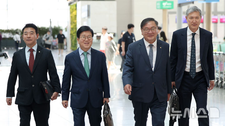 [인천공항=뉴시스] 김선웅 기자 = 박병석 전 국회의장을 단장으로 하는 대통령 중국 특사단이 24일 인천국제공항을 통해 출국하고 있다. 왼쪽부터 박정 더불어민주당 의원, 박병석 전 국회의장, 김태년 더불어민주당 의원, 노재헌 동아시아문화재단 이사장. 2025.08.24. [email protected]