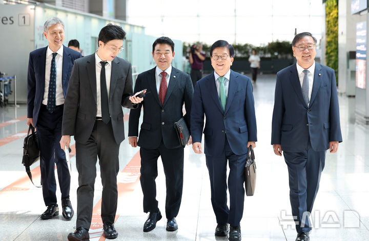 [인천공항=뉴시스] 김선웅 기자 = 박병석 전 국회의장을 단장으로 하는 대통령 중국 특사단이 24일 인천국제공항을 통해 출국하고 있다. 왼쪽부터 노재헌 동아시아문화재단 이사장, 왼쪽 세 번째부터 박정 더불어민주당 의원, 박병석 전 국회의장, 김태년 더불어민주당 의원. 2025.08.24. [email protected]