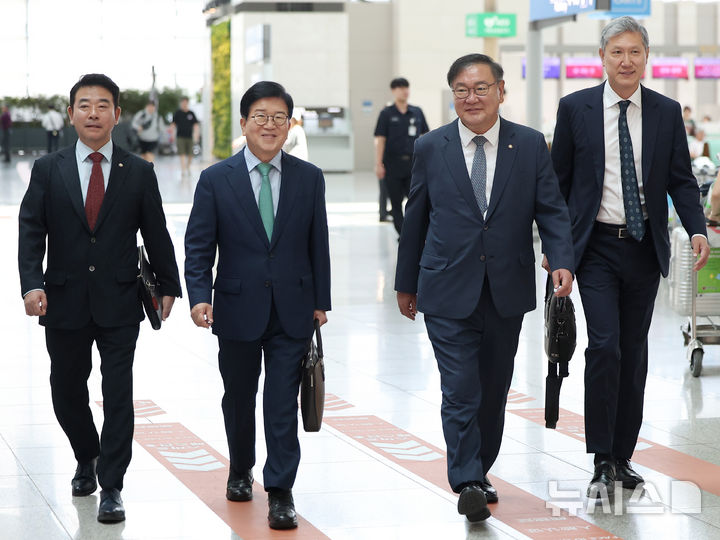 [인천공항=뉴시스] 김선웅 기자 = 박병석 전 국회의장을 단장으로 하는 대통령 중국 특사단이 24일 인천국제공항을 통해 출국하고 있다. 왼쪽부터 박정 더불어민주당 의원, 박병석 전 국회의장, 김태년 더불어민주당 의원, 노재헌 동아시아문화재단 이사장. 2025.08.24. [email protected]