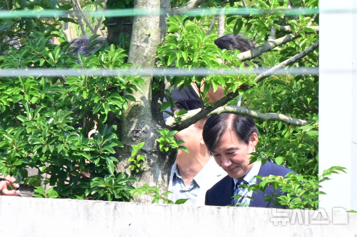 [양산=뉴시스] 차용현 기자 = 조국 전 조국혁신당 대표가 24일 경남 양산시 평산마을을 문재인 전 대통령 사저로 들어서고 있다. 2025.08.24. [email protected]
