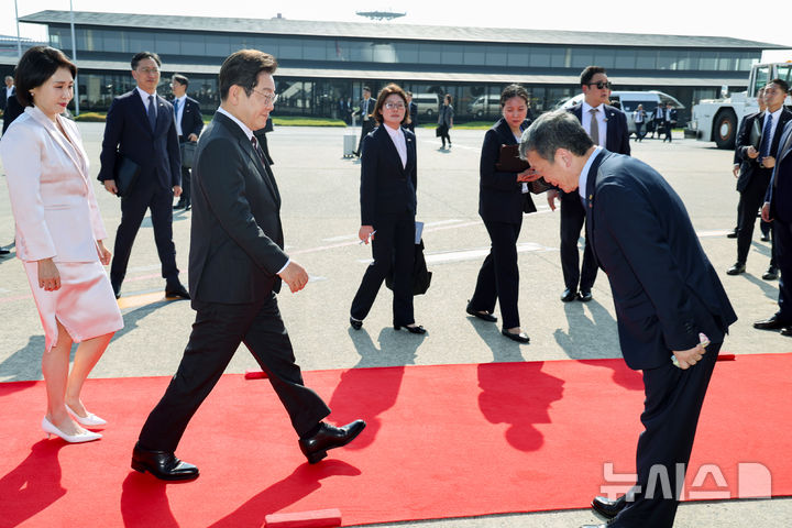 [도쿄=뉴시스] 고범준 기자 = 일본 방문 일정을 마친 이재명 대통령과 김혜경 여사가 23일 도쿄 하네다공항에서 미국 워싱턴DC로 출발하기 위해 공군 1호기로 향하고 있다. 2025.08.24. [email protected]