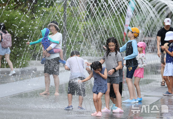 [서울=뉴시스] 김명원 기자 = 여름이 지나면 더위도 가시고 신선한 가을을 맞이하게 된다는 처서(23일)를 하루 지난 24일 서울 종로구 광화문 광장 분수터널에는 어린이들이 이어지는 더위를 식히며 물놀이를 하고 있다. 2025.08.24. [email protected]