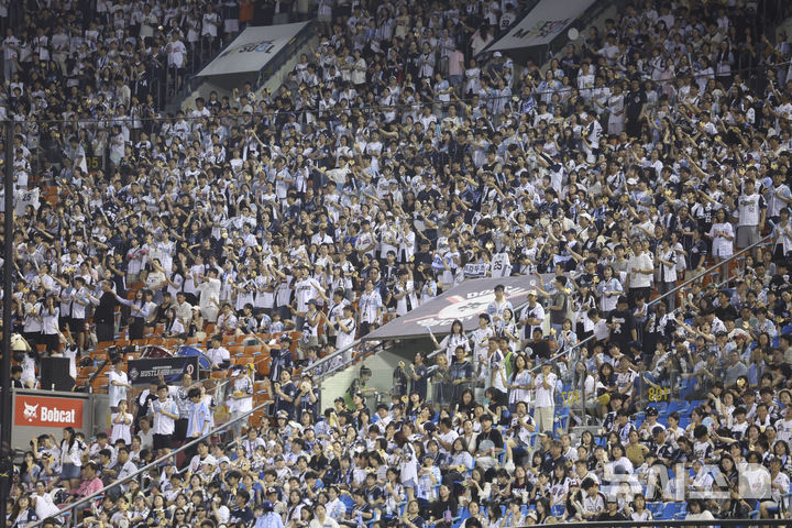 [서울=뉴시스] 김근수 기자 = 한국 프로야구 KBO리그 관중 수가 2년 연속 1천만명 기록한 가운데 24일 서울 송파구 잠실야구장에서 열린 프로야구 '2025 신한 SOL 뱅크 KBO리그' KT 위즈와 두산 베어스의 경기에서 관중들이 열띤 응원을 펼치고 있다. 2025.08.24. [email protected]