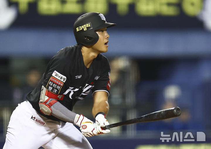 [서울=뉴시스] 김근수 기자 = 24일 서울 송파구 잠실야구장에서 열린 프로야구 '2025 신한 SOL 뱅크 KBO리그' KT 위즈와 두산 베어스의 경기, 8회초 2사 주자 1,2루 상황에서 KT 장진혁이 역전 쓰리런 홈런을 치고 있다. 2025.08.24. [email protected]