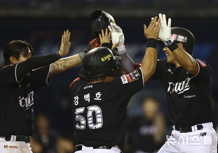 [서울=뉴시스] 김근수 기자 = 24일 서울 송파구 잠실야구장에서 열린 프로야구 '2025 신한 SOL 뱅크 KBO리그' KT 위즈와 두산 베어스의 경기, 8회초 2사 주자 1,2루 상황에서 KT 장진혁이 역전 쓰리런 홈런을 치고 베이스를 돌고 선수들과 기뻐하고 있다. 2025.08.24. [email protected]